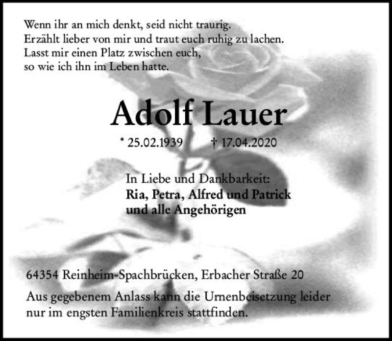 Hier finden Sie alle Traueranzeigen aus der Zeitung, die bisher für Adolf Lauer erschienen sind. Weitere Traueranzeigen, die in der Zeitung erscheinen, werden hier ebenfalls aufgelistet