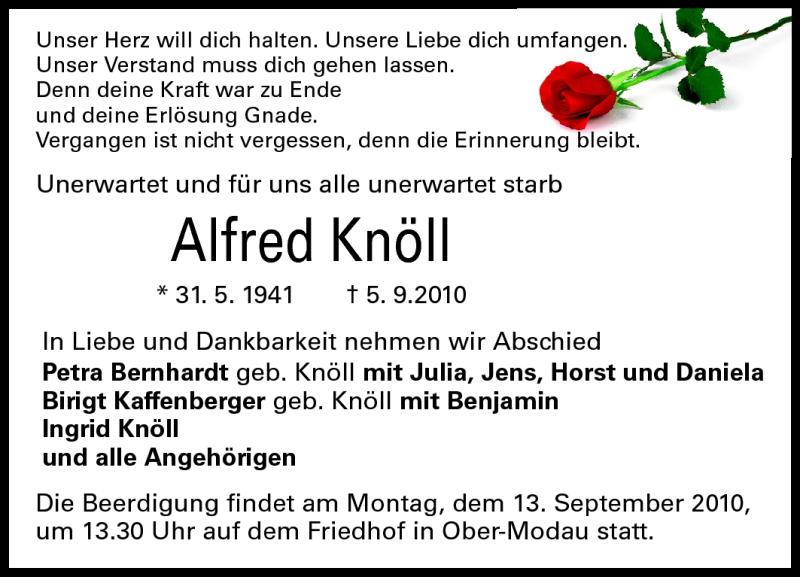 Hier finden Sie alle Traueranzeigen aus der Zeitung, die bisher für Alfred Knöll erschienen sind. Weitere Traueranzeigen, die in der Zeitung erscheinen, werden hier ebenfalls aufgelistet