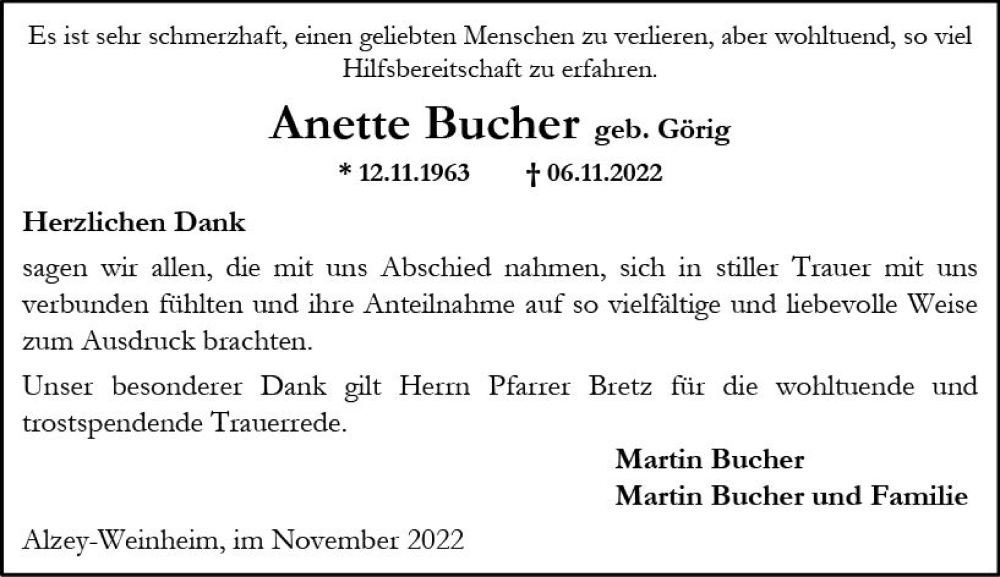 Hier finden Sie alle Traueranzeigen aus der Zeitung, die bisher für Anette Bucher erschienen sind. Weitere Traueranzeigen, die in der Zeitung erscheinen, werden hier ebenfalls aufgelistet