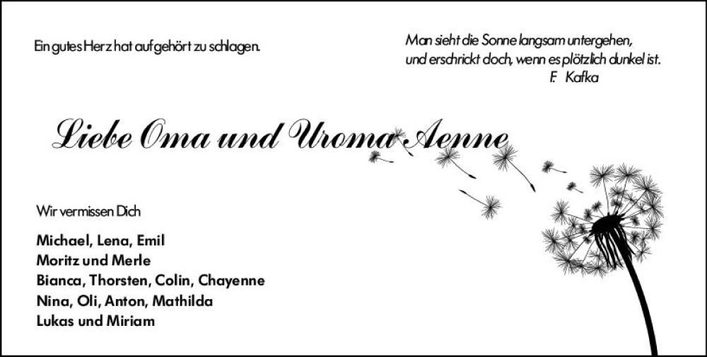 Hier finden Sie alle Traueranzeigen aus der Zeitung, die bisher für Anna Bulat erschienen sind. Weitere Traueranzeigen, die in der Zeitung erscheinen, werden hier ebenfalls aufgelistet