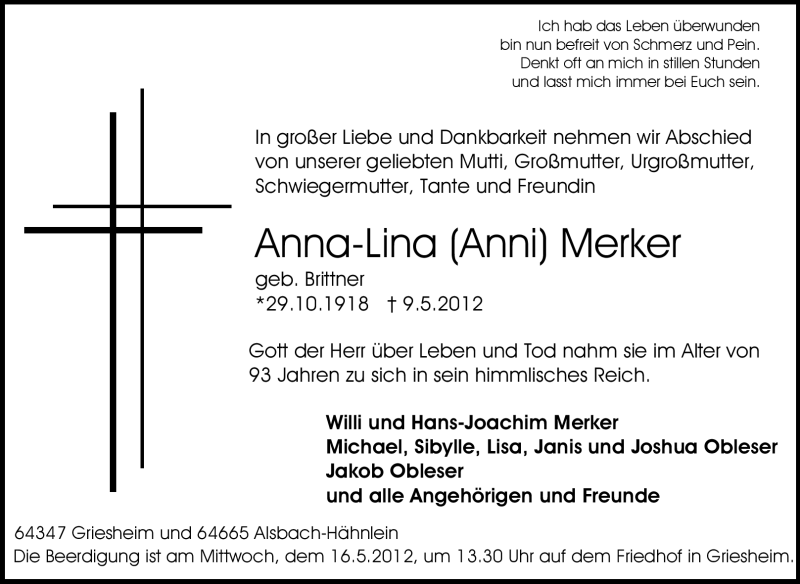 Hier finden Sie alle Traueranzeigen aus der Zeitung, die bisher für Anna-Lina Merker erschienen sind. Weitere Traueranzeigen, die in der Zeitung erscheinen, werden hier ebenfalls aufgelistet