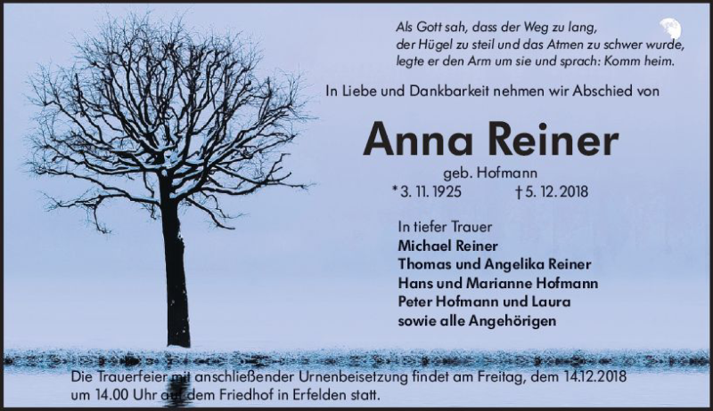 Hier finden Sie alle Traueranzeigen aus der Zeitung, die bisher für Anna Reiner erschienen sind. Weitere Traueranzeigen, die in der Zeitung erscheinen, werden hier ebenfalls aufgelistet