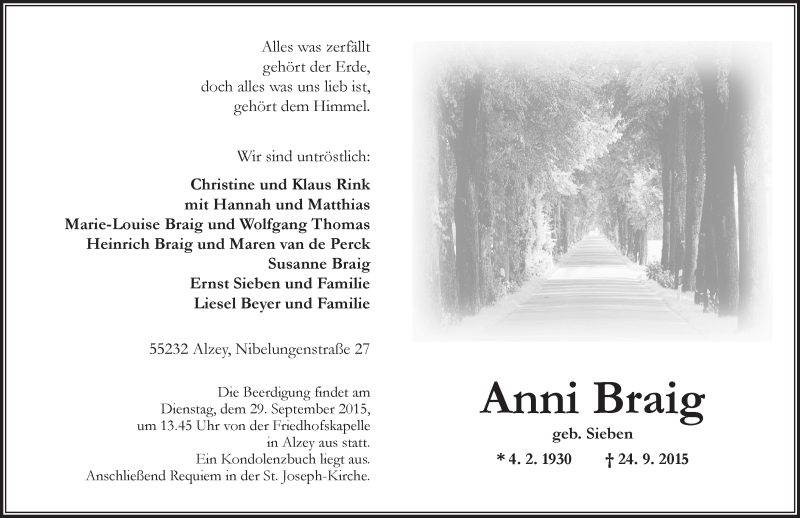 Hier finden Sie alle Traueranzeigen aus der Zeitung, die bisher für Anni Braig erschienen sind. Weitere Traueranzeigen, die in der Zeitung erscheinen, werden hier ebenfalls aufgelistet
