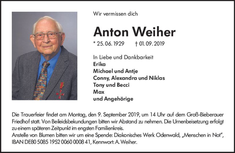Hier finden Sie alle Traueranzeigen aus der Zeitung, die bisher für Anton Weiher erschienen sind. Weitere Traueranzeigen, die in der Zeitung erscheinen, werden hier ebenfalls aufgelistet