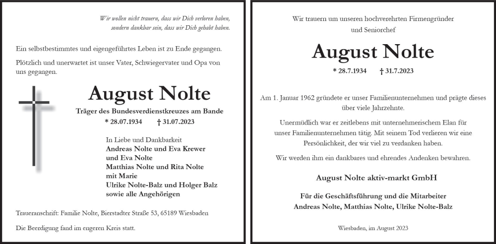 Hier finden Sie alle Traueranzeigen aus der Zeitung, die bisher für August Nolte erschienen sind. Weitere Traueranzeigen, die in der Zeitung erscheinen, werden hier ebenfalls aufgelistet