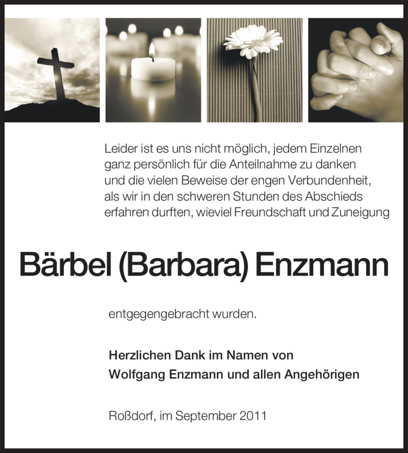 Hier finden Sie alle Traueranzeigen aus der Zeitung, die bisher für Bärbel Barbara Enzmann erschienen sind. Weitere Traueranzeigen, die in der Zeitung erscheinen, werden hier ebenfalls aufgelistet