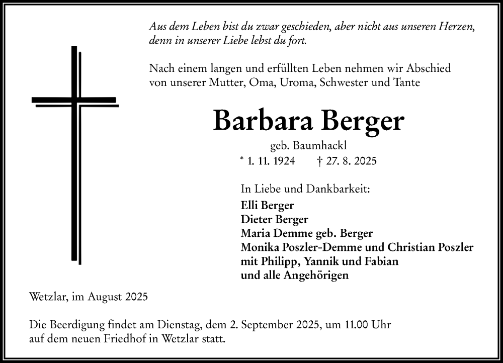 Hier finden Sie alle Traueranzeigen aus der Zeitung, die bisher für Barbara Berger erschienen sind. Weitere Traueranzeigen, die in der Zeitung erscheinen, werden hier ebenfalls aufgelistet
