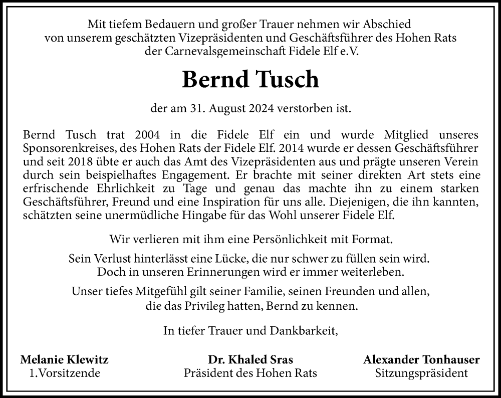 Hier finden Sie alle Traueranzeigen aus der Zeitung, die bisher für Bernd Tusch erschienen sind. Weitere Traueranzeigen, die in der Zeitung erscheinen, werden hier ebenfalls aufgelistet