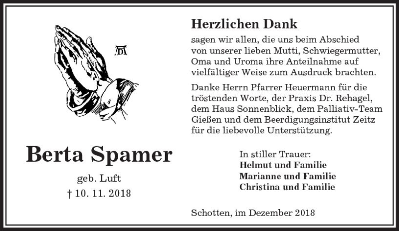 Hier finden Sie alle Traueranzeigen aus der Zeitung, die bisher für Berta Spamer erschienen sind. Weitere Traueranzeigen, die in der Zeitung erscheinen, werden hier ebenfalls aufgelistet