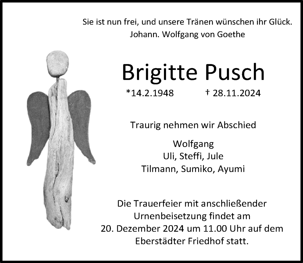 Hier finden Sie alle Traueranzeigen aus der Zeitung, die bisher für Brigitte Pusch erschienen sind. Weitere Traueranzeigen, die in der Zeitung erscheinen, werden hier ebenfalls aufgelistet