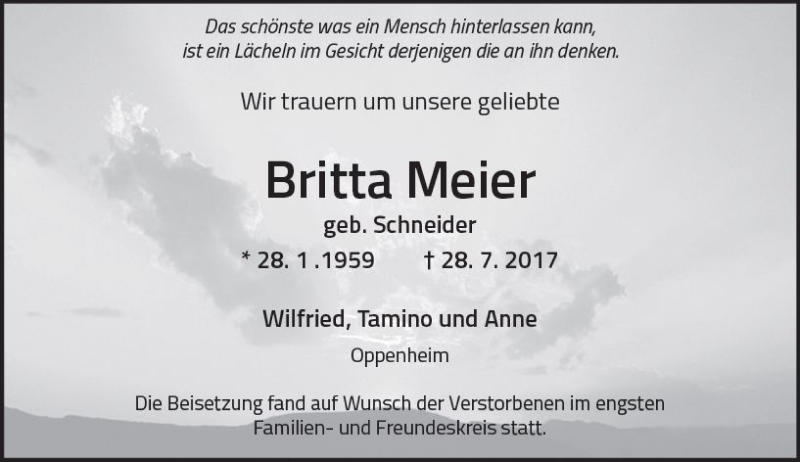 Hier finden Sie alle Traueranzeigen aus der Zeitung, die bisher für Britta Meier erschienen sind. Weitere Traueranzeigen, die in der Zeitung erscheinen, werden hier ebenfalls aufgelistet