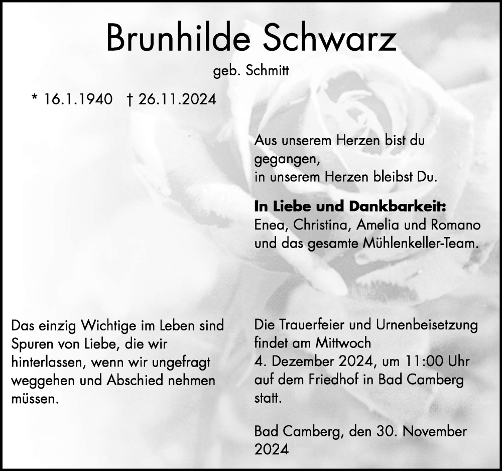 Hier finden Sie alle Traueranzeigen aus der Zeitung, die bisher für Brunhilde Schwarz erschienen sind. Weitere Traueranzeigen, die in der Zeitung erscheinen, werden hier ebenfalls aufgelistet