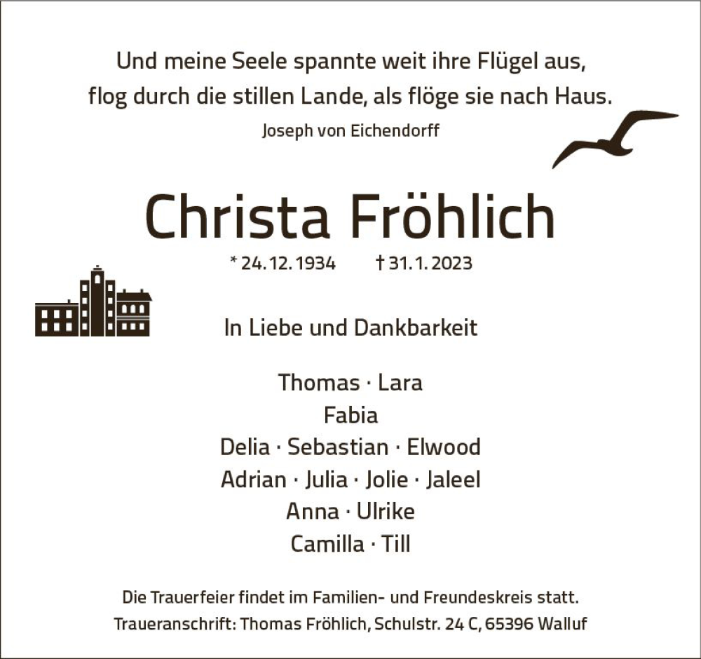 Hier finden Sie alle Traueranzeigen aus der Zeitung, die bisher für Christa Fröhlich erschienen sind. Weitere Traueranzeigen, die in der Zeitung erscheinen, werden hier ebenfalls aufgelistet