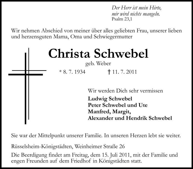 Hier finden Sie alle Traueranzeigen aus der Zeitung, die bisher für Christa Schwebel erschienen sind. Weitere Traueranzeigen, die in der Zeitung erscheinen, werden hier ebenfalls aufgelistet