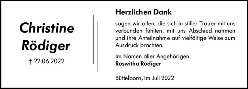 Hier finden Sie alle Traueranzeigen aus der Zeitung, die bisher für Christine Rödinger erschienen sind. Weitere Traueranzeigen, die in der Zeitung erscheinen, werden hier ebenfalls aufgelistet