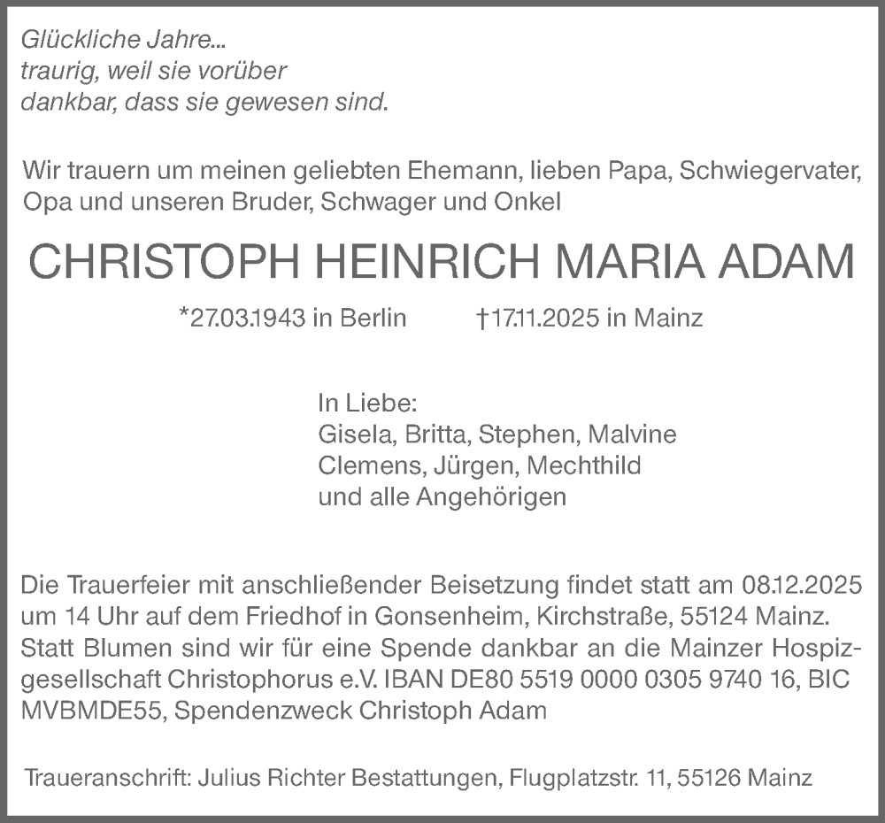 Hier finden Sie alle Traueranzeigen aus der Zeitung, die bisher für Christoph Heinrich Maria Adam erschienen sind. Weitere Traueranzeigen, die in der Zeitung erscheinen, werden hier ebenfalls aufgelistet