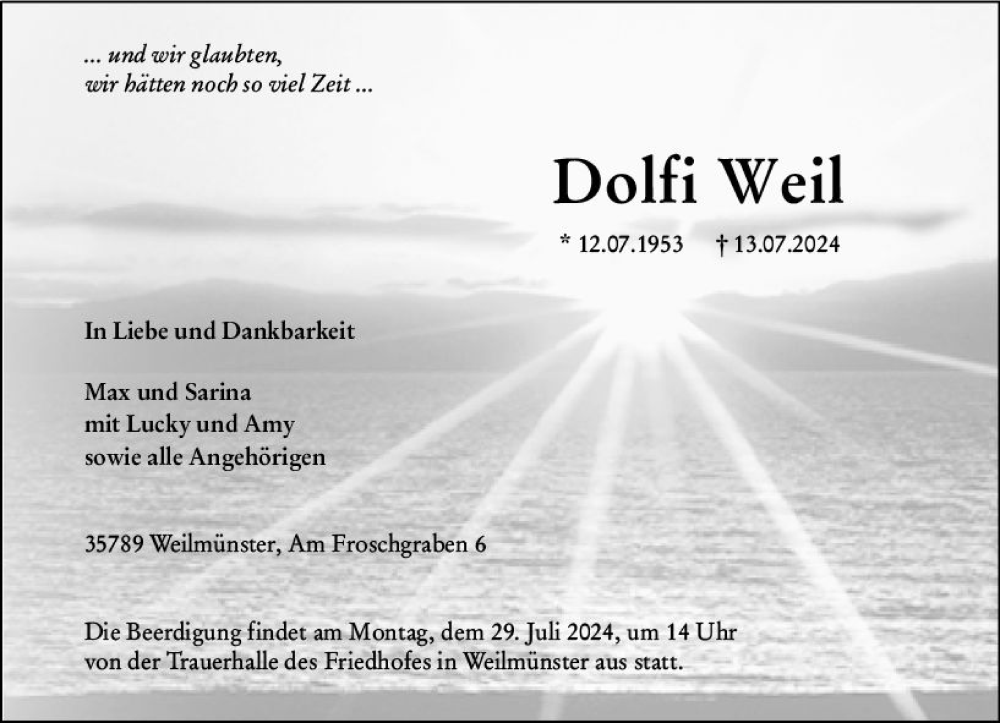Hier finden Sie alle Traueranzeigen aus der Zeitung, die bisher für Dolfi Weil erschienen sind. Weitere Traueranzeigen, die in der Zeitung erscheinen, werden hier ebenfalls aufgelistet
