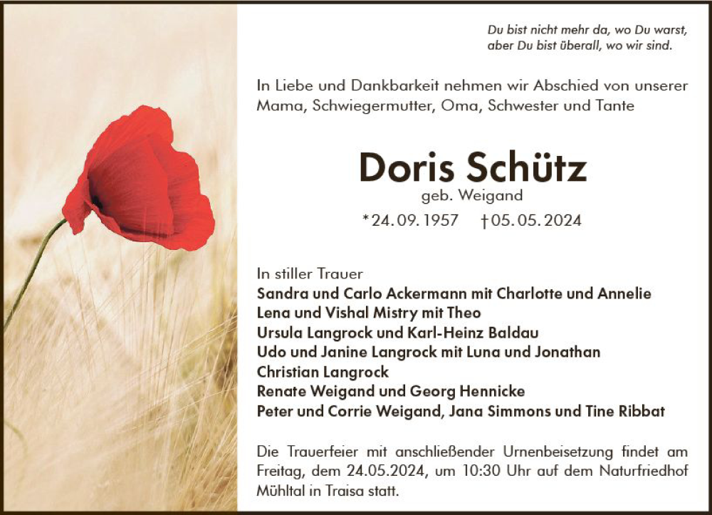 Hier finden Sie alle Traueranzeigen aus der Zeitung, die bisher für Doris Schütz erschienen sind. Weitere Traueranzeigen, die in der Zeitung erscheinen, werden hier ebenfalls aufgelistet
