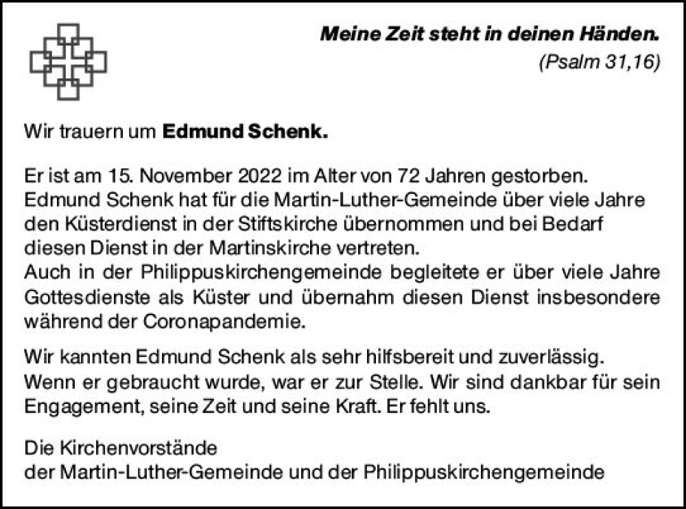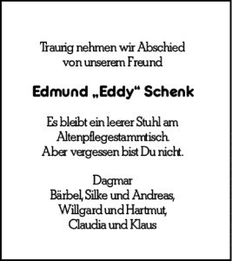 Hier finden Sie alle Traueranzeigen aus der Zeitung, die bisher für Edmund Schenk erschienen sind. Weitere Traueranzeigen, die in der Zeitung erscheinen, werden hier ebenfalls aufgelistet