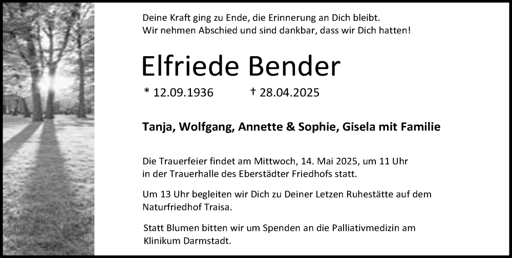 Hier finden Sie alle Traueranzeigen aus der Zeitung, die bisher für Elfriede Bender erschienen sind. Weitere Traueranzeigen, die in der Zeitung erscheinen, werden hier ebenfalls aufgelistet