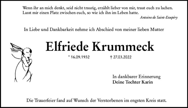 Hier finden Sie alle Traueranzeigen aus der Zeitung, die bisher für Elfriede Krummeck erschienen sind. Weitere Traueranzeigen, die in der Zeitung erscheinen, werden hier ebenfalls aufgelistet