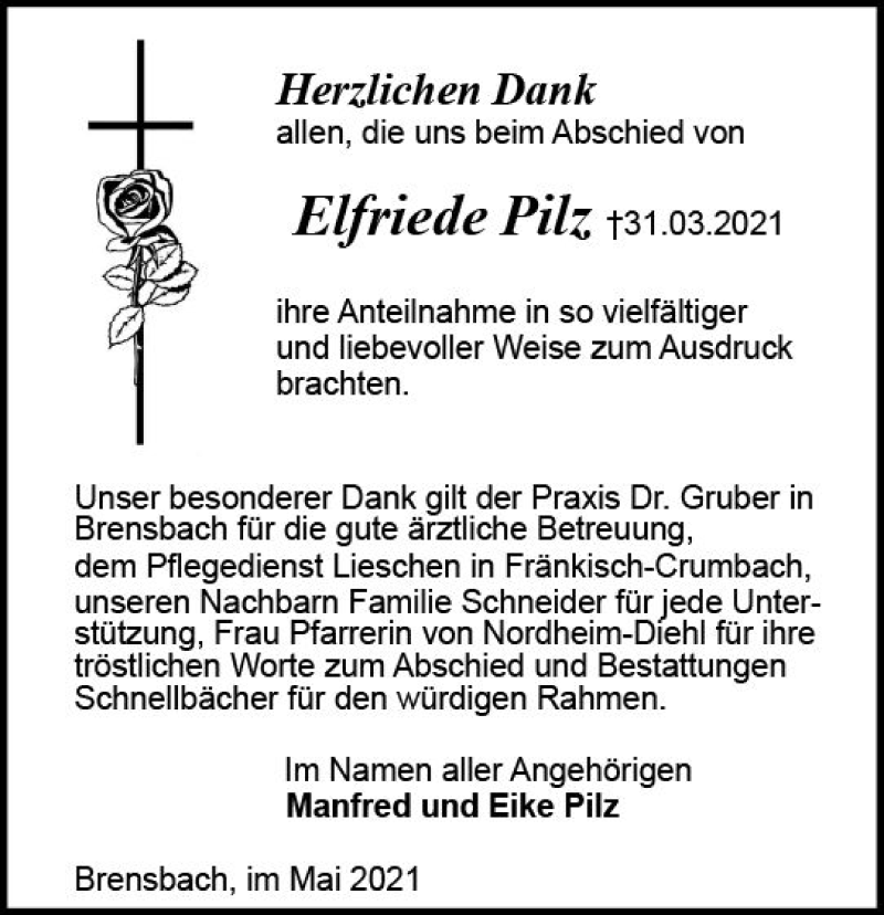 Hier finden Sie alle Traueranzeigen aus der Zeitung, die bisher für Elfriede Pilz erschienen sind. Weitere Traueranzeigen, die in der Zeitung erscheinen, werden hier ebenfalls aufgelistet