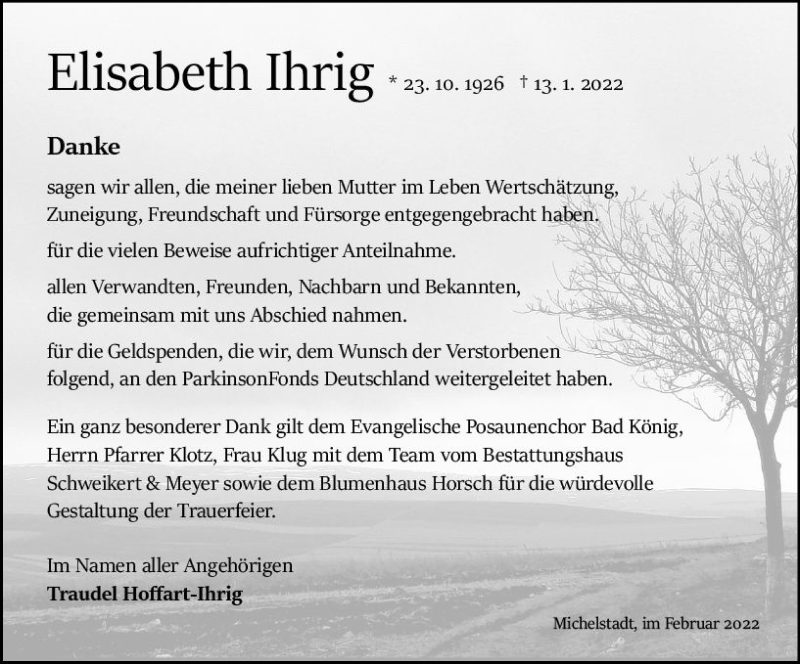 Hier finden Sie alle Traueranzeigen aus der Zeitung, die bisher für Elisabeth Ihrig erschienen sind. Weitere Traueranzeigen, die in der Zeitung erscheinen, werden hier ebenfalls aufgelistet