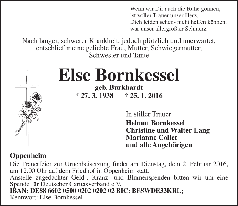 Hier finden Sie alle Traueranzeigen aus der Zeitung, die bisher für Else Bornkessel erschienen sind. Weitere Traueranzeigen, die in der Zeitung erscheinen, werden hier ebenfalls aufgelistet