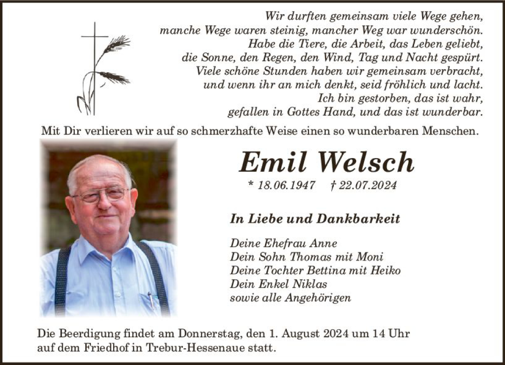 Hier finden Sie alle Traueranzeigen aus der Zeitung, die bisher für Emil Welsch erschienen sind. Weitere Traueranzeigen, die in der Zeitung erscheinen, werden hier ebenfalls aufgelistet