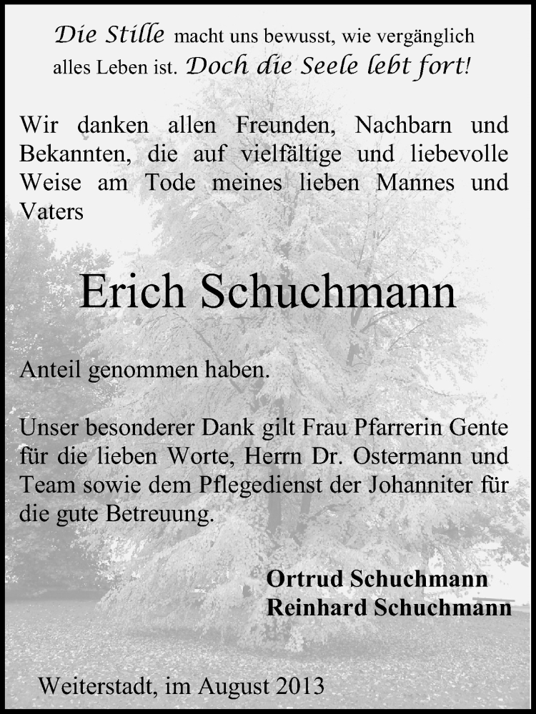 Hier finden Sie alle Traueranzeigen aus der Zeitung, die bisher für Erich Schuchmann erschienen sind. Weitere Traueranzeigen, die in der Zeitung erscheinen, werden hier ebenfalls aufgelistet