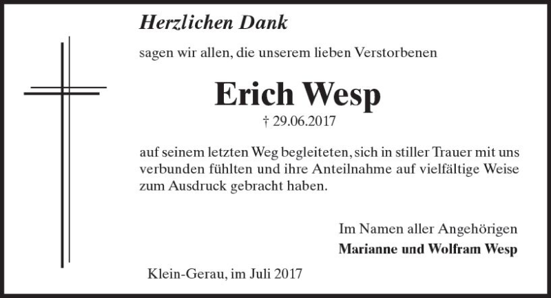 Hier finden Sie alle Traueranzeigen aus der Zeitung, die bisher für Erich Wesp erschienen sind. Weitere Traueranzeigen, die in der Zeitung erscheinen, werden hier ebenfalls aufgelistet
