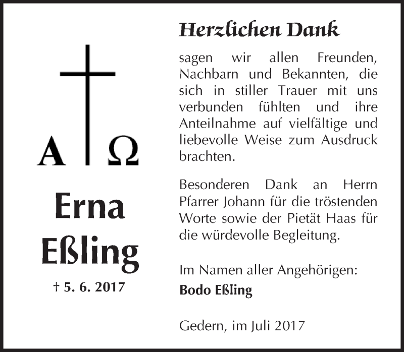 Hier finden Sie alle Traueranzeigen aus der Zeitung, die bisher für Erna Eßling erschienen sind. Weitere Traueranzeigen, die in der Zeitung erscheinen, werden hier ebenfalls aufgelistet