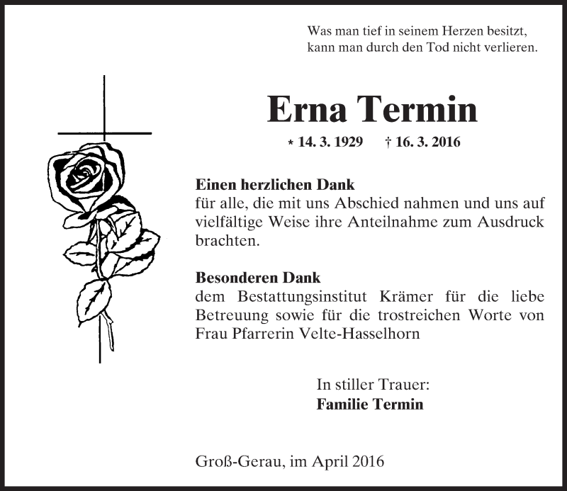Hier finden Sie alle Traueranzeigen aus der Zeitung, die bisher für Erna Termin erschienen sind. Weitere Traueranzeigen, die in der Zeitung erscheinen, werden hier ebenfalls aufgelistet