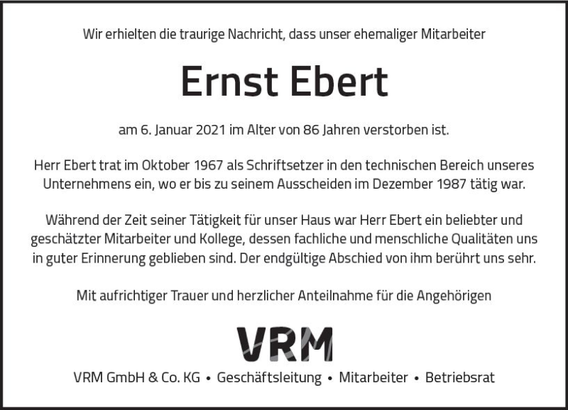 Hier finden Sie alle Traueranzeigen aus der Zeitung, die bisher für Ernst Ebert erschienen sind. Weitere Traueranzeigen, die in der Zeitung erscheinen, werden hier ebenfalls aufgelistet