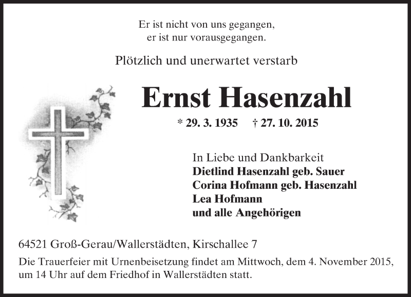 Hier finden Sie alle Traueranzeigen aus der Zeitung, die bisher für Ernst Hasenzahl erschienen sind. Weitere Traueranzeigen, die in der Zeitung erscheinen, werden hier ebenfalls aufgelistet