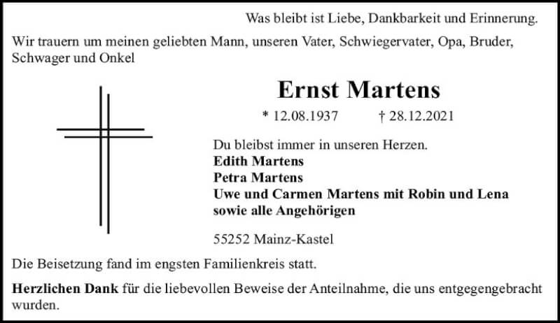 Hier finden Sie alle Traueranzeigen aus der Zeitung, die bisher für Ernst Martens erschienen sind. Weitere Traueranzeigen, die in der Zeitung erscheinen, werden hier ebenfalls aufgelistet