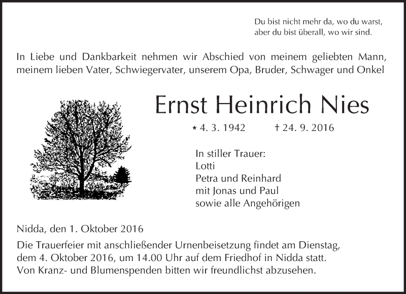 Hier finden Sie alle Traueranzeigen aus der Zeitung, die bisher für Ernst Heinrich Nies erschienen sind. Weitere Traueranzeigen, die in der Zeitung erscheinen, werden hier ebenfalls aufgelistet