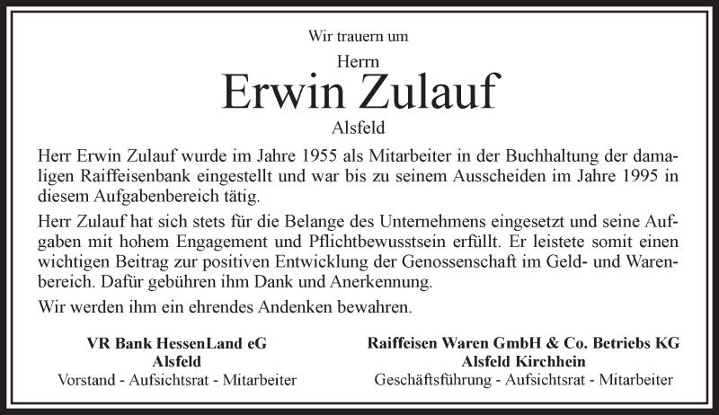 Hier finden Sie alle Traueranzeigen aus der Zeitung, die bisher für Erwin Zulauf erschienen sind. Weitere Traueranzeigen, die in der Zeitung erscheinen, werden hier ebenfalls aufgelistet
