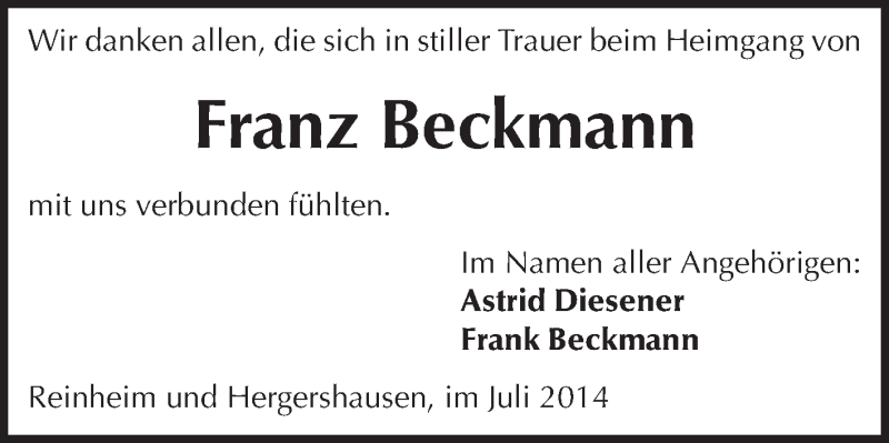 Hier finden Sie alle Traueranzeigen aus der Zeitung, die bisher für Franz Beckmann erschienen sind. Weitere Traueranzeigen, die in der Zeitung erscheinen, werden hier ebenfalls aufgelistet