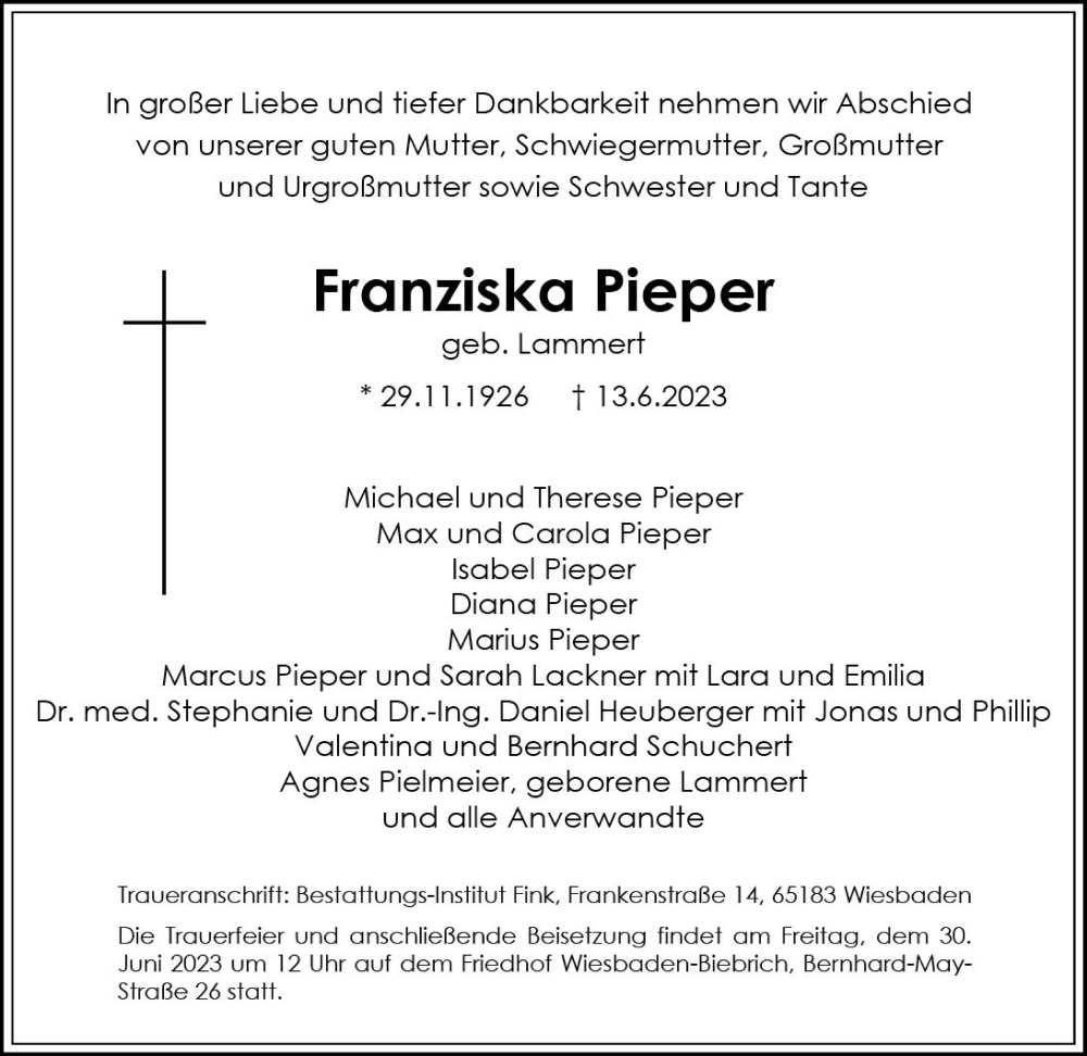 Hier finden Sie alle Traueranzeigen aus der Zeitung, die bisher für Franziska Pieper erschienen sind. Weitere Traueranzeigen, die in der Zeitung erscheinen, werden hier ebenfalls aufgelistet