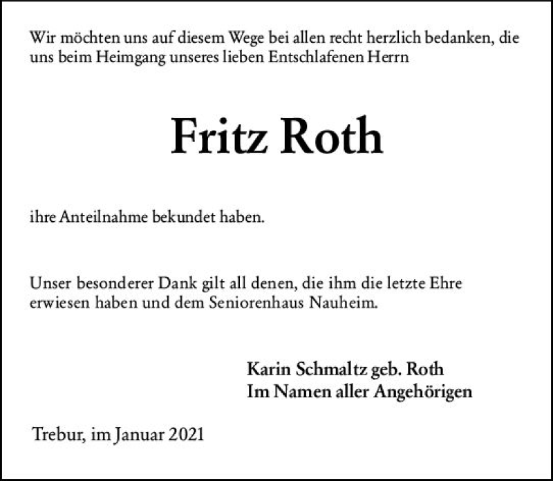 Hier finden Sie alle Traueranzeigen aus der Zeitung, die bisher für Fritz Roth erschienen sind. Weitere Traueranzeigen, die in der Zeitung erscheinen, werden hier ebenfalls aufgelistet