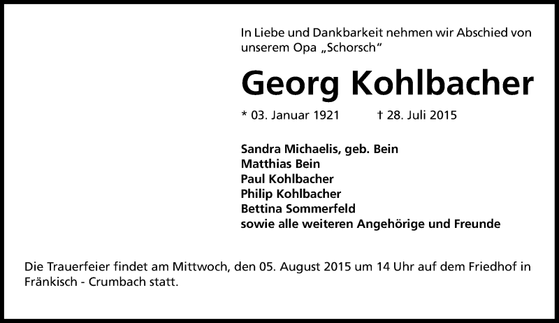 Hier finden Sie alle Traueranzeigen aus der Zeitung, die bisher für Georg Kohlbacher erschienen sind. Weitere Traueranzeigen, die in der Zeitung erscheinen, werden hier ebenfalls aufgelistet