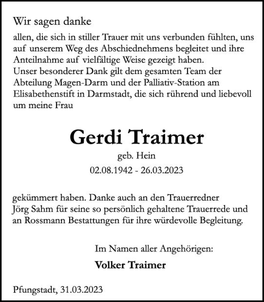 Hier finden Sie alle Traueranzeigen aus der Zeitung, die bisher für Gerdi Traimer erschienen sind. Weitere Traueranzeigen, die in der Zeitung erscheinen, werden hier ebenfalls aufgelistet