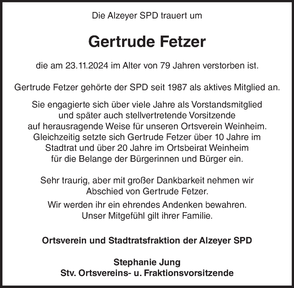 Hier finden Sie alle Traueranzeigen aus der Zeitung, die bisher für Gertrude Fetzer erschienen sind. Weitere Traueranzeigen, die in der Zeitung erscheinen, werden hier ebenfalls aufgelistet