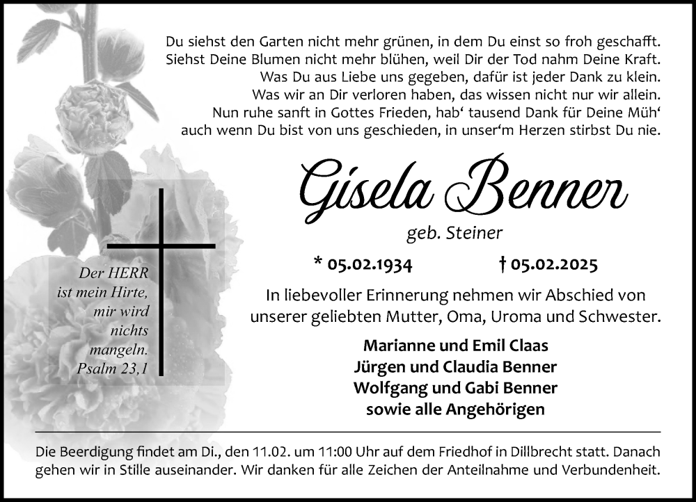 Hier finden Sie alle Traueranzeigen aus der Zeitung, die bisher für Gisela Benner erschienen sind. Weitere Traueranzeigen, die in der Zeitung erscheinen, werden hier ebenfalls aufgelistet