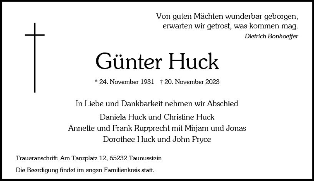 Hier finden Sie alle Traueranzeigen aus der Zeitung, die bisher für Günter Huck erschienen sind. Weitere Traueranzeigen, die in der Zeitung erscheinen, werden hier ebenfalls aufgelistet