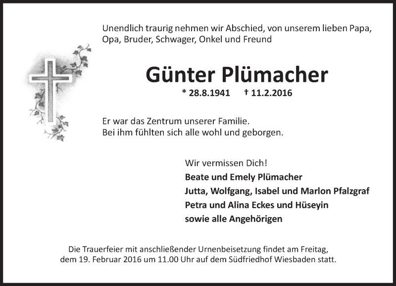 Hier finden Sie alle Traueranzeigen aus der Zeitung, die bisher für Günter Plümacher erschienen sind. Weitere Traueranzeigen, die in der Zeitung erscheinen, werden hier ebenfalls aufgelistet
