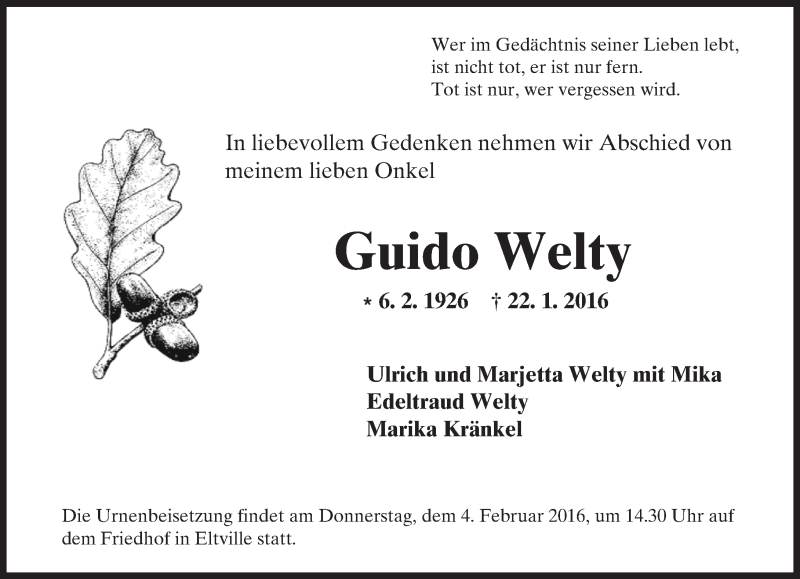 Hier finden Sie alle Traueranzeigen aus der Zeitung, die bisher für Guido Welty erschienen sind. Weitere Traueranzeigen, die in der Zeitung erscheinen, werden hier ebenfalls aufgelistet