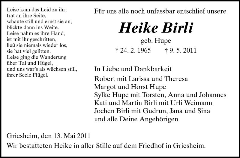 Hier finden Sie alle Traueranzeigen aus der Zeitung, die bisher für Heike Birli erschienen sind. Weitere Traueranzeigen, die in der Zeitung erscheinen, werden hier ebenfalls aufgelistet