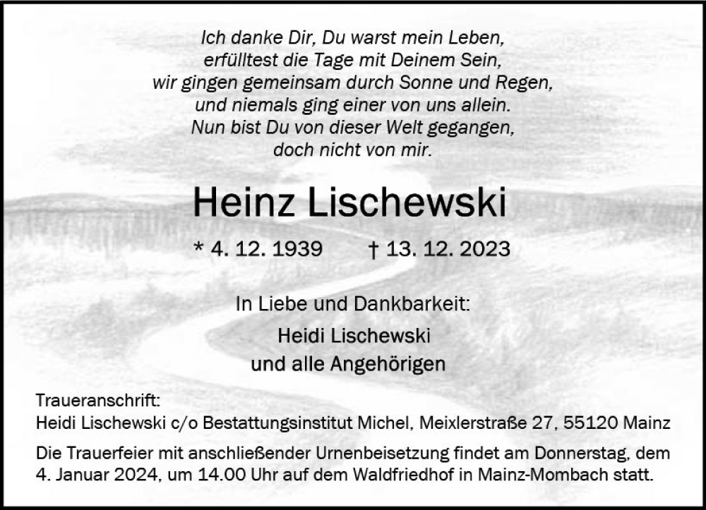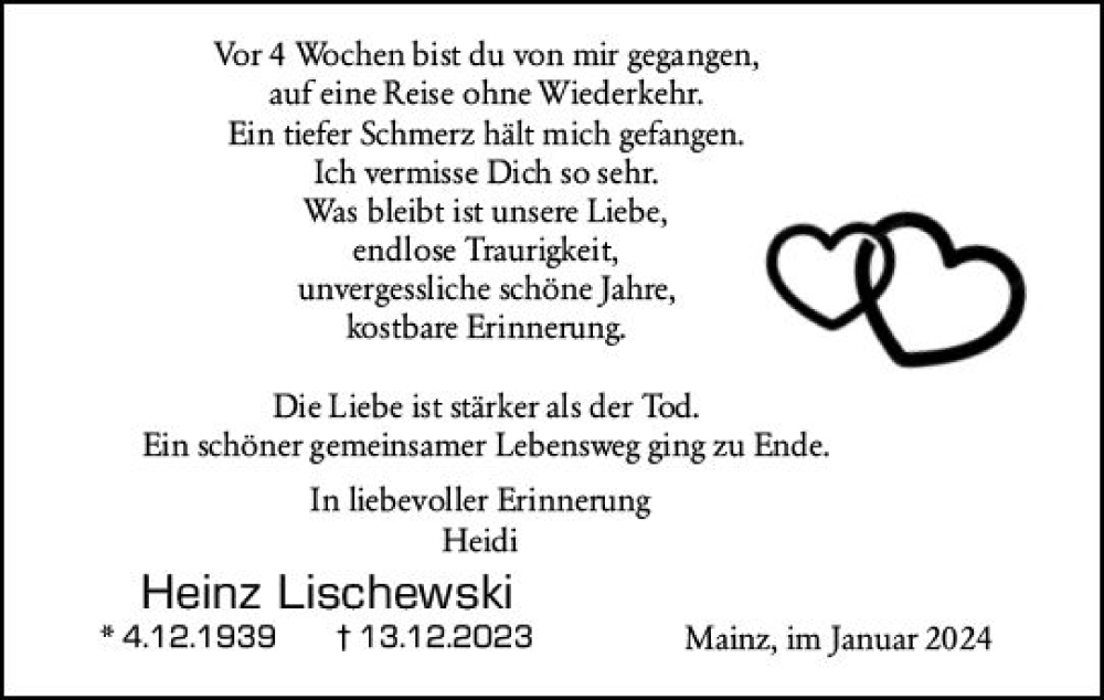 Hier finden Sie alle Traueranzeigen aus der Zeitung, die bisher für Heinz Lischewski erschienen sind. Weitere Traueranzeigen, die in der Zeitung erscheinen, werden hier ebenfalls aufgelistet
